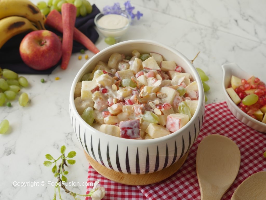 Add apple,grapes,mixed fruit cocktail,pomegranate,banana,almonds & mix well.