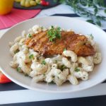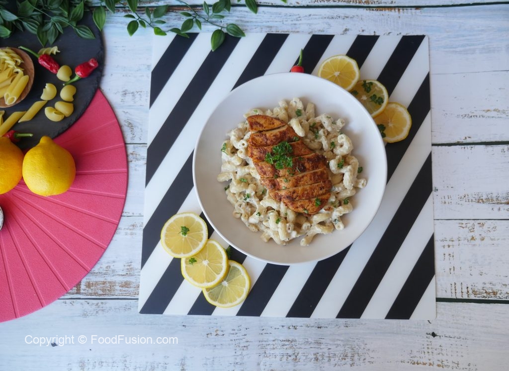 Serving plate mein pasta dal ker grilled chicken rakh dein aur fresh parsley sa garnish ker ka serve karein!
