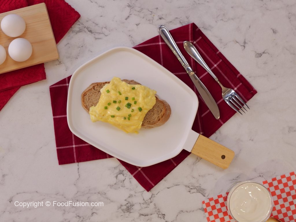 -Scrambled egg ko sour bread ka supper rakh dein & hara pyaz leaves dal ker serve karein!