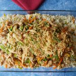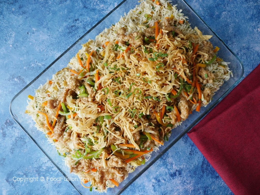 Serving dish mein fried rice,crispy fried chicken with vegetables aur fried egg noodles,hara pyaz ka leaves dal ker serve karein.
