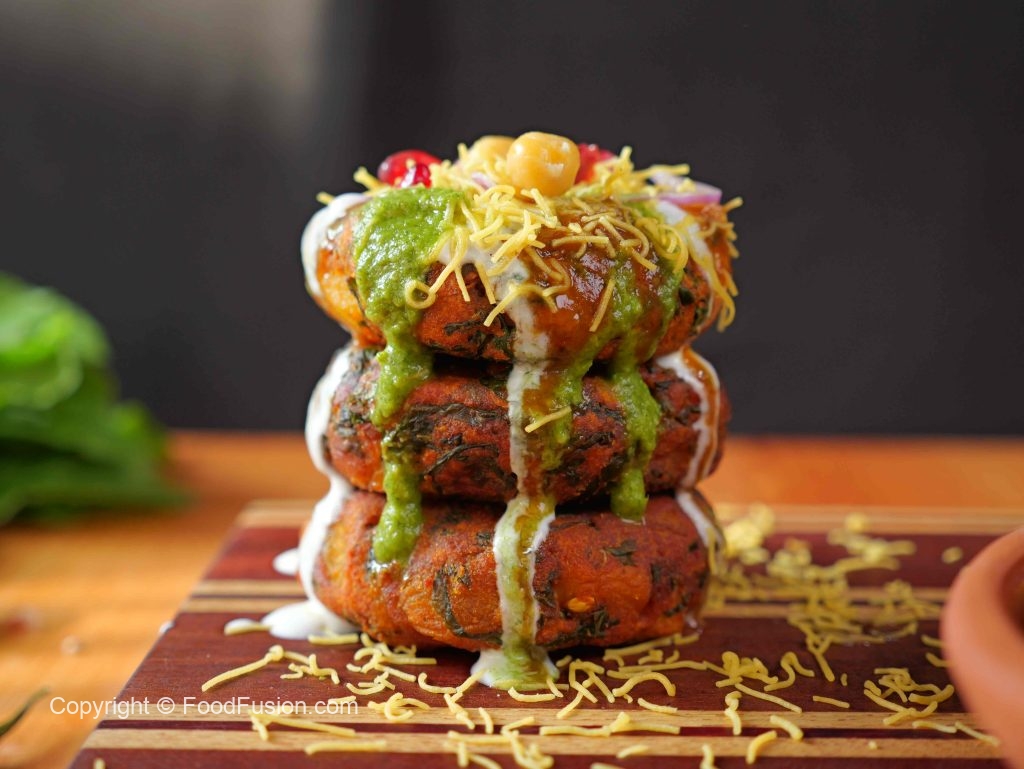 -In a serving plate add fried Aloo tikki, smashed it, add boiled white chickpea, yogurt, gur imli chutney, prepared green chutney, onions, boiled white chickpea, daal sev, pomegranate corns & serve!