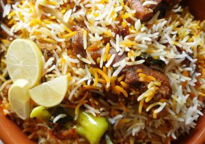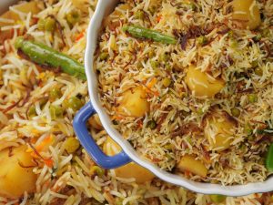 Add dissolve food color and fried onion,cover and steam cook on low flame for 8-10 minutes & serve!