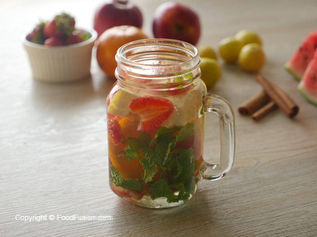 In jug,add strawberries,grape fruit,orange,kiwi,mint leaves,apple cider vinegar and cold water,stir & cover.