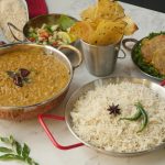 Dish out rice, daal, garnish with fresh coriander, kababs & serve with salad.