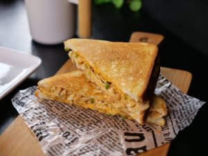 -Bread slice par chicken filling spread karein,cheese slice rakh kar dusri bread slice se cover karein, upar se melted butter brush karein.