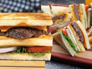 -Cast iron frying pan heat karein, sandwich (upside down) rakh kar dusri side par bhi melted butter brush karein,dono sides se golden & crispy ho janay tak grill ker lein (makes 6).