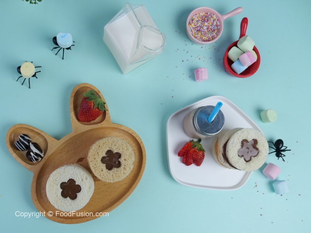 -Bread slice per chunky peanut butter dal ker pheela lein,dosra bread slice rakh ker marshmallow fluff dal ker pheela lein,ek aur bread slice rakh dein phir Nutella dal ker pheela lein,top bread slice rakh ker sandwich tayyar ker lein (makes 2-3 sandwiches).