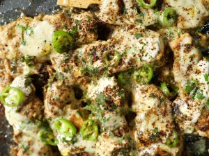 -Cream,adrak,hari mirch,hara dhania,cheddar cheese,kali crushed aur makhan dal ker dhak dein aur halki ancch per cheese melt ho janay tak paka lein.