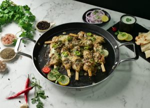 -Chicken pieces ko skewers per laga lein (make 8-10 sticks).