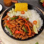 -Serving bowl mein boiled rice,tayyar fajita chicken,tayyar tomato sauce,iceberg,corn cob,lemon wedges & cherry tomato ka saath serve karein!