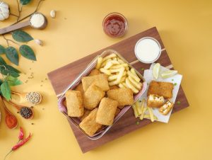 French fries,tomato ketchup & garlic dip ka saath serve karein!