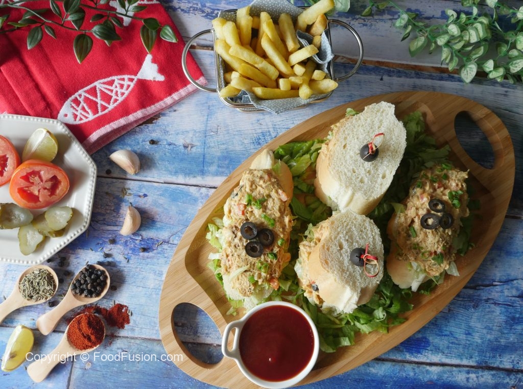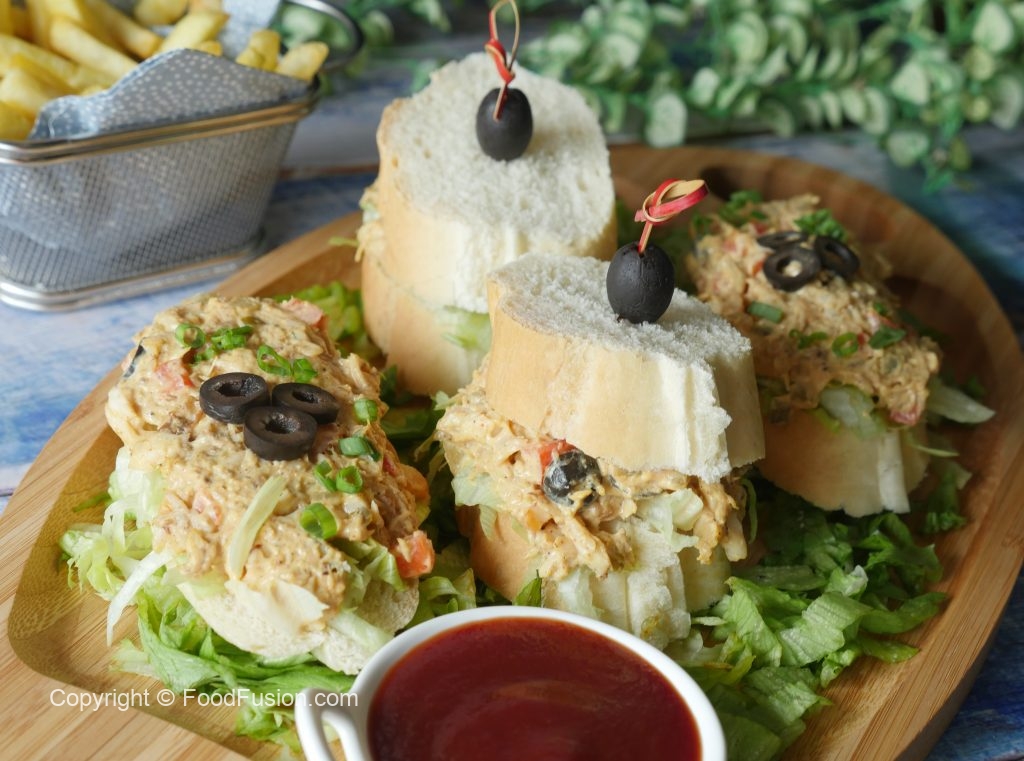 On french bread slice,add iceberg lettuce,prepared fish filling and place another french bread slice on top and & garnish with black olive.