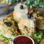 On french bread slice,add iceberg,prepared fish filling,black olives,green onion leaves (makes 8-10) & serve!