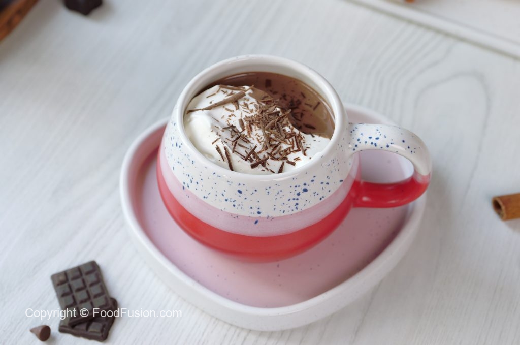 -In serving cup,add hot chocolate,whipped cream & sprinkle chocolate shavings & serve!