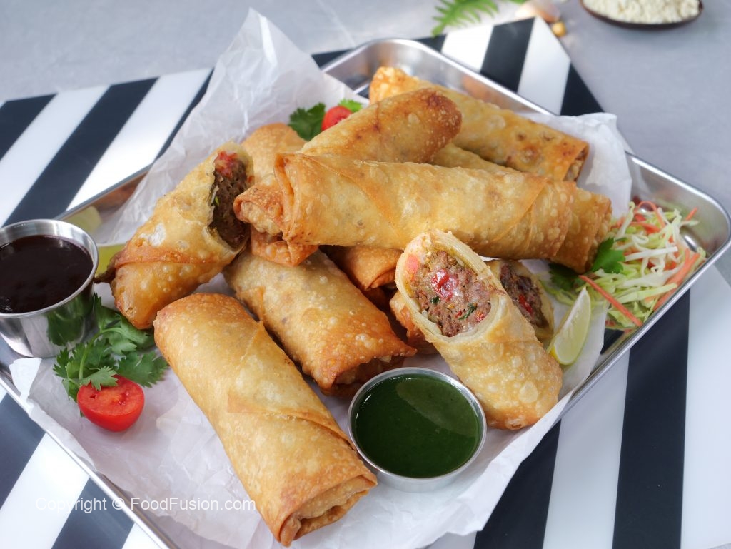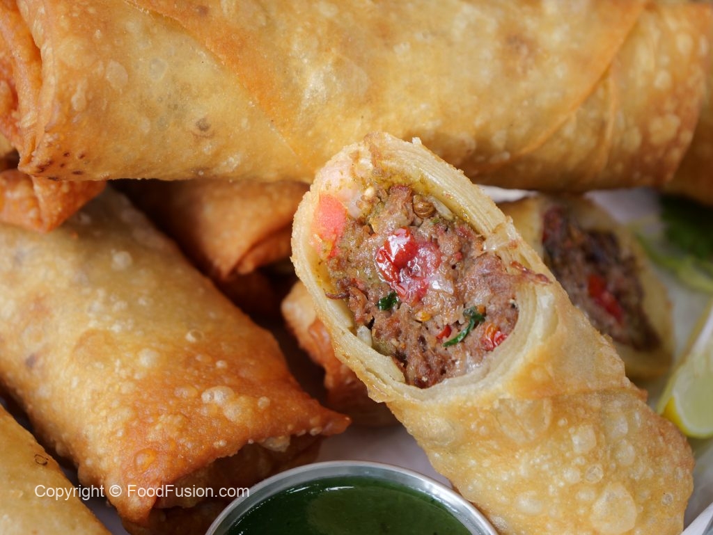 -On a roll sheet,place fusion seekhkab,prepared khatti green chutney,tomato,onion,roll up & apply flour slurry (makes 14).