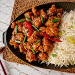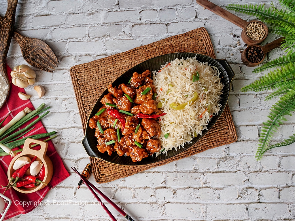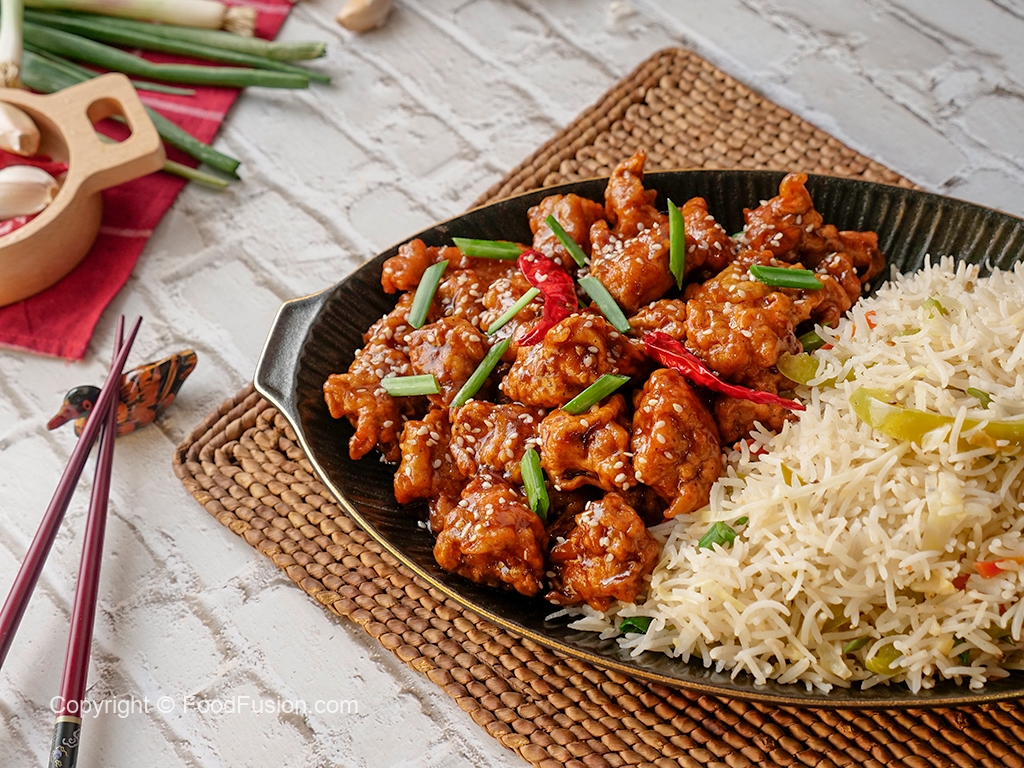 Garnish with sesame seeds,green onion leaves & serve with fried rice.