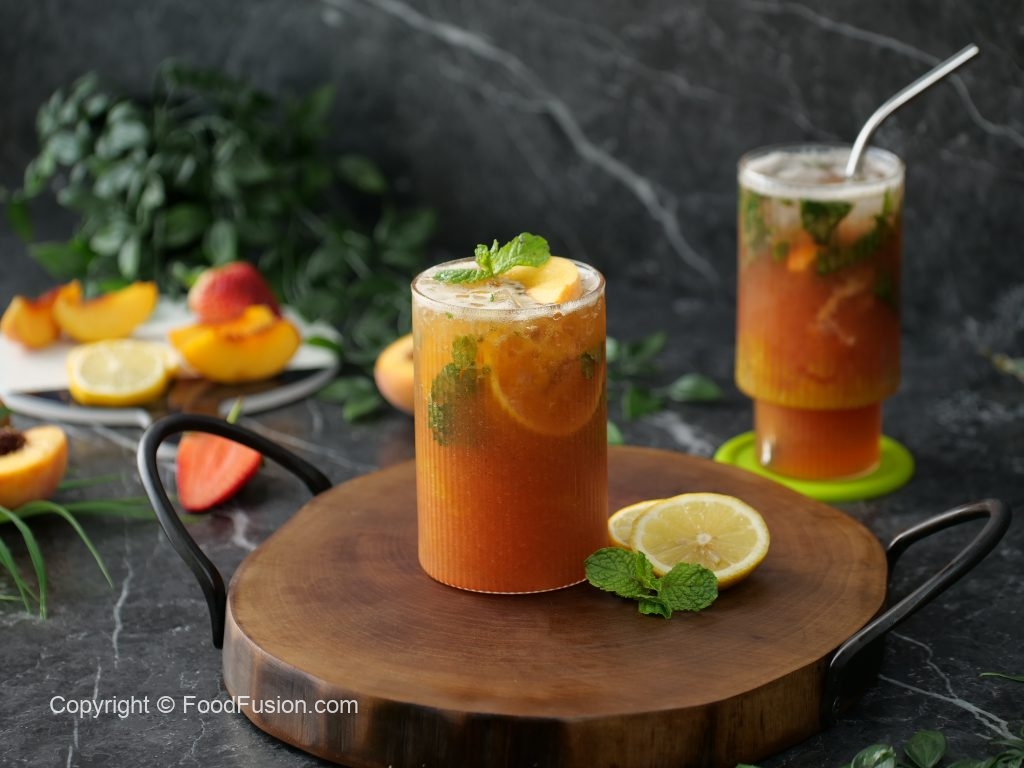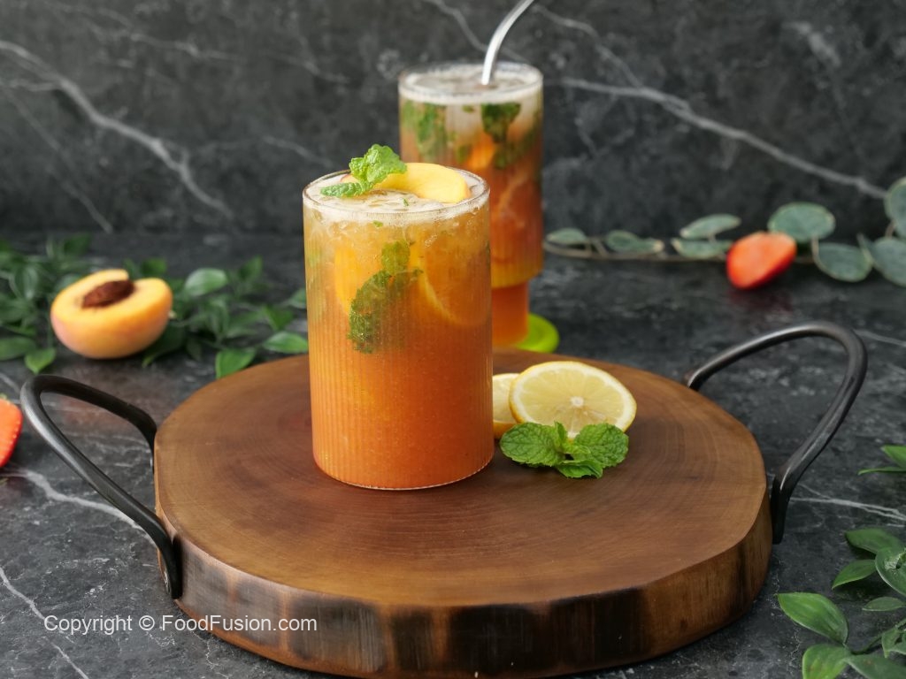 -Garnish with peach slice,mint leaves & serve!
