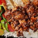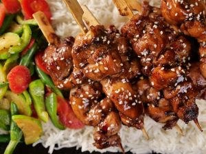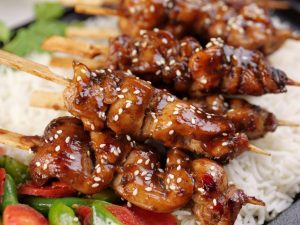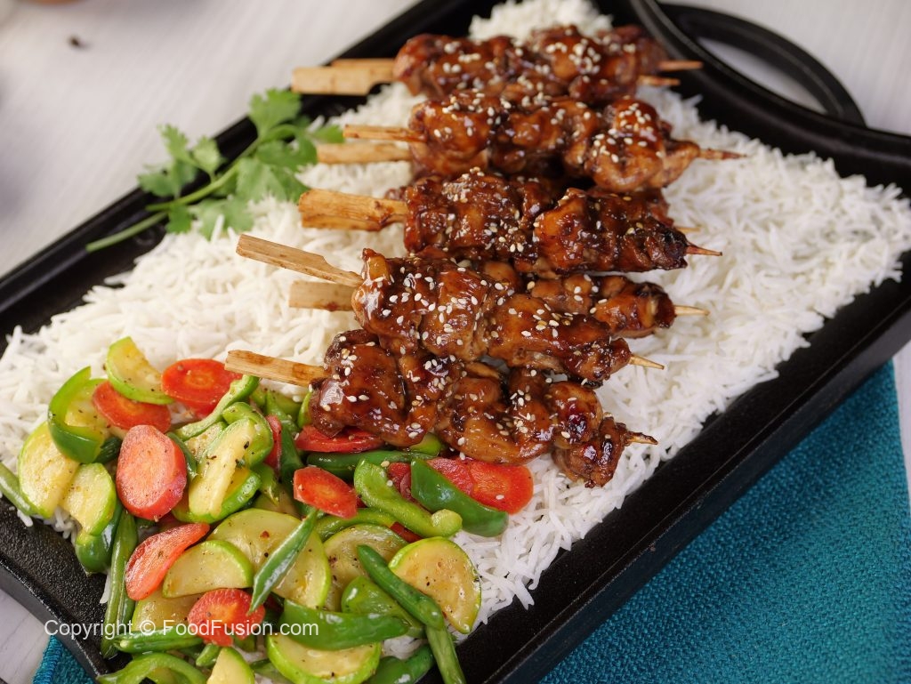 -Sprinkle sesame seeds & serve grilled teriyaki chicken with boiled rice & sautéed vegetables.