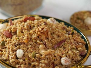 -Phir se ghee melt karein aur almonds, pistachios, cashews, walnuts aur dried coconut add karke low flame par 3-4 minutes fry karein.
