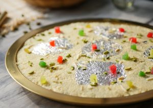 Garnish it with edible silver leaf, tutti frutti & pistachios, serve!