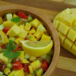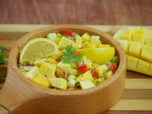 In bowl add mango cubes, cucumber cubes and tomato cubes, corn boiled and coriander leaves.