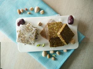 In chopper,add almonds,pistachio,flax seeds,coconut oil,dates and chop until well combined.