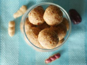 In chopper,add peanuts,desiccated coconut,instant oats,dates,organic peanut butter and chop until well combined.