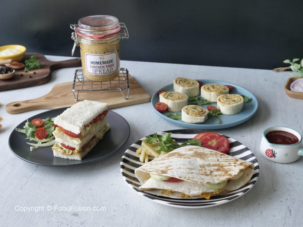 Bread slice per chicken tikka spread dal ker pheela lein,iceberg,tamatar slices rakh per upper sa ek aur bread slice rakh dein,pieces mein cut ker ka serve karein!
