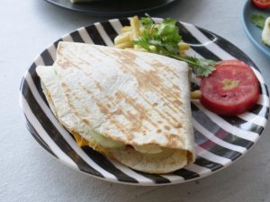 Cut one side of tortilla,add & spread chicken tikka spread,cheese slice,cucumber,tomato, potato fries and drizzle tomato ketchup,fold and grill for a minute & serve!