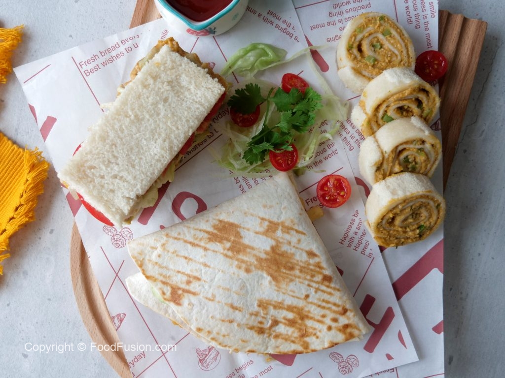 On bread slices,add & spread chicken tikka spread,iceburg,tomato slices and top with another bread slice,cut into pieces & serve!