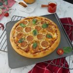 -Dough ko 2 portions (350g each) mein divide ker lein aur maida chirak ker rolling pin ki madad sa bail lein (13-inch).