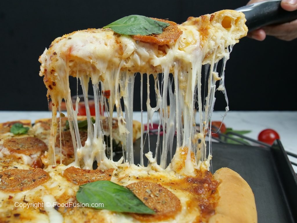 -Ab tayyar red sauce dal ker pheela lein,cheddar cheese,mozzarella cheese & chicken pepperoni dal dein.