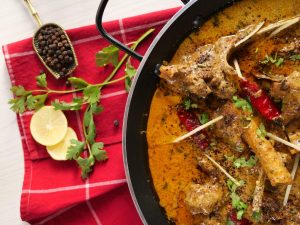 -In a bowl,add mutton chops,mutton mixed boti,pink salt,red chilli powder,garam masala powder, coriander powder,turmeric powder,cumin seeds,ginger garlic paste,lemon juice & mix well,cover & marinate for 1-2 hours.