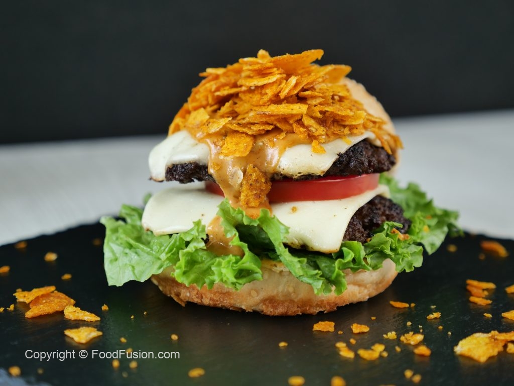 -On a burger bun,add & spread prepared fusion burger sauce,add salad leaves,burger patty with cheese, tomato slice,burger patty with cheese,fusion burger sauce,spicy chips (coarsely crush with hands) & serve with french fries (makes 3 burgers).