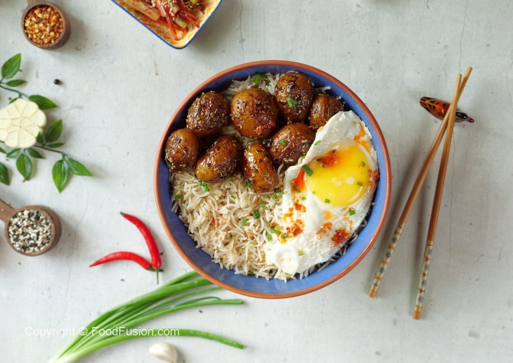 -In a serving bowl,add korean rice,korean potatoes & fried egg.