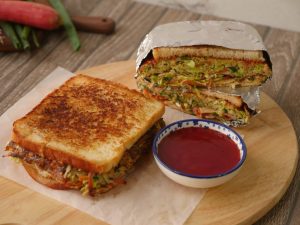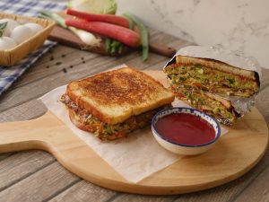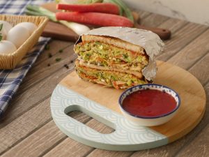 On griddle,apply butter,add vegetable & egg mixture,trying to make it as a square shape,cover and cook on low flame for 2-3 minutes then carefully flip the mixture and cook on low flame for a minute.