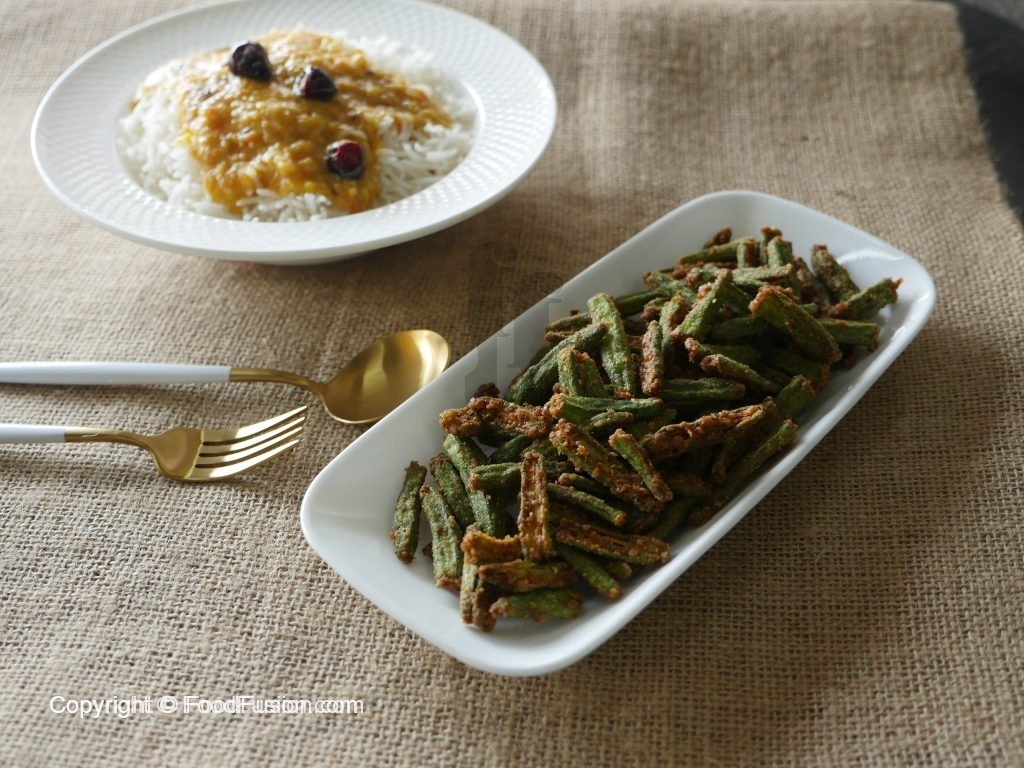 Bowl mein bhindi,lal mirch powder,garam masala powder,haldee powder,namak aur dhania powder dal ker ache tarhan mix karein aur 10 minutes kliya rakh dein.