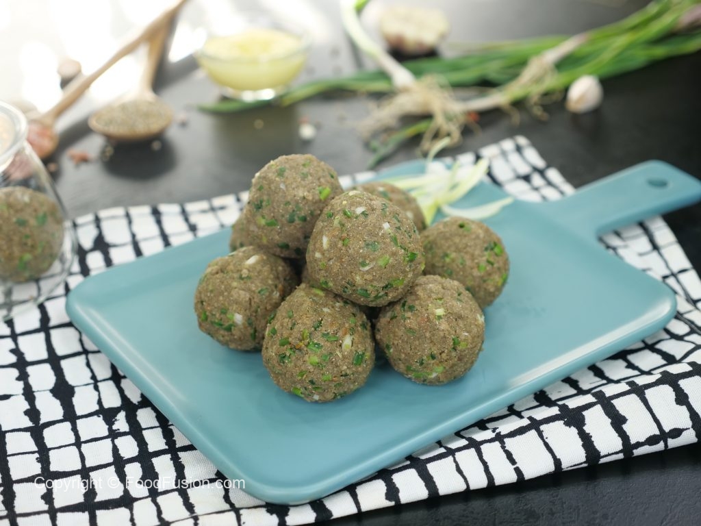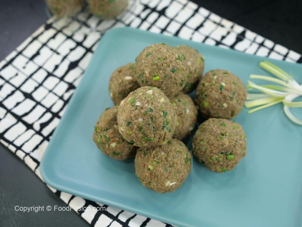 Take a small quantity of mixture (50g) & make ladoo of equal sizes (makes 12).