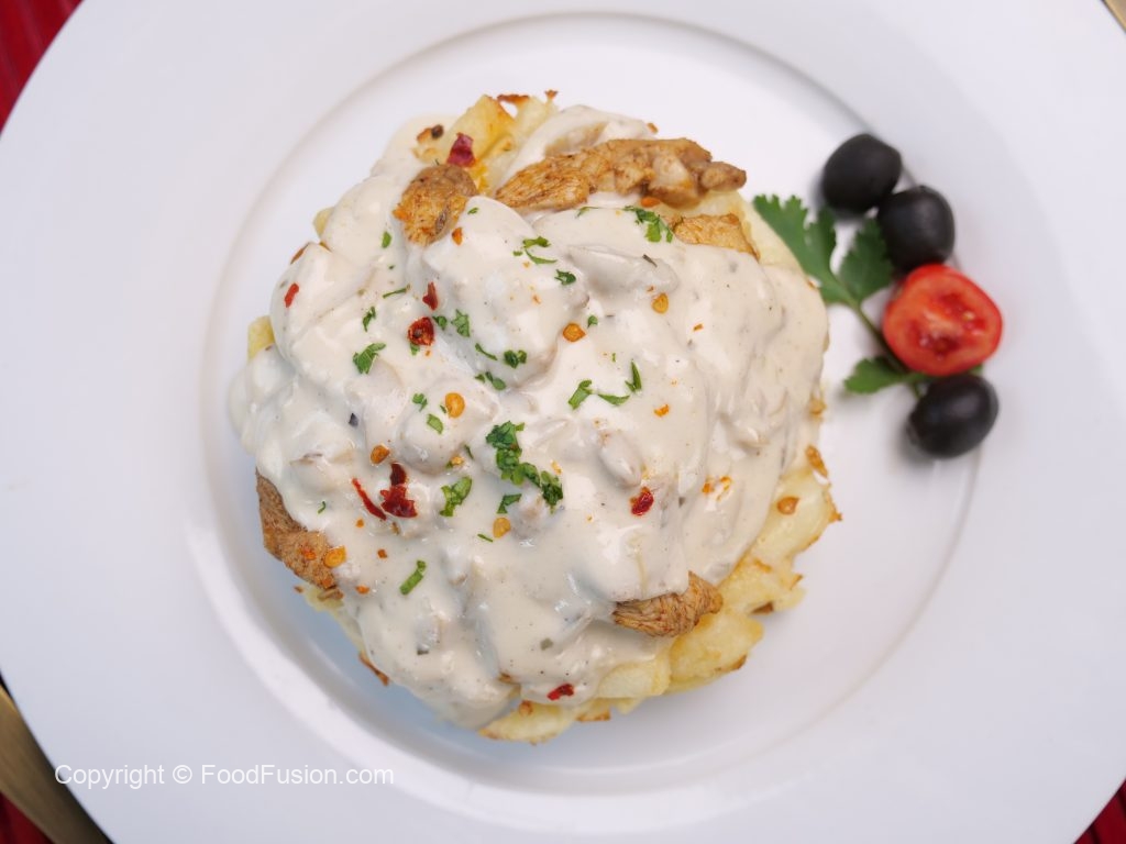 -In baking pan,add potato fries,creamy alfredo sauce,mozzarella cheese,potato fries,mozzarella cheese,red chilli crushed & fresh parsley.