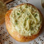 In bread bowl,add mac n cheese pasta,mozzarella cheese,parmesan cheese powder,fresh parsley and cover with top.