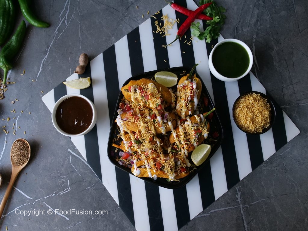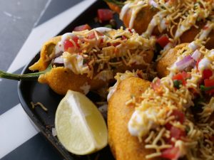 -Now add onion, tomatoes, fresh coriander, chaat masala, yogurt, nimco sev & red chilli crushed from top & serve!