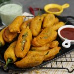 -Cut mirchi pakora from center and place them on a serving plate. Add green lentil gram in it.