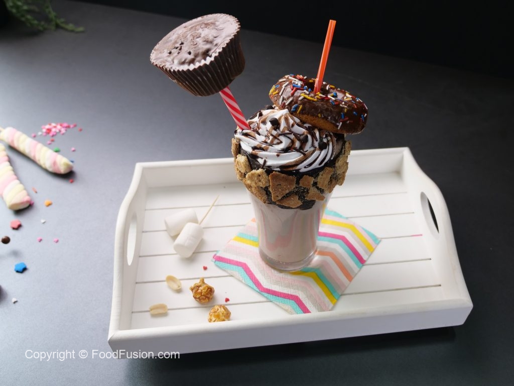 -Add prepared chocolate shake,whipped cream & decorate with chocolate syrup,chocolate sprinkles, chocolate chips, triple chocolate cupcake,donut & serve.