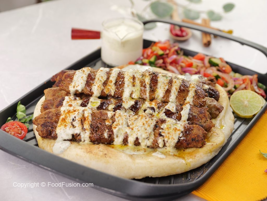 -Toasted naan per kabab rakh dein,tayyar sauce aur chaat masala dal dein.