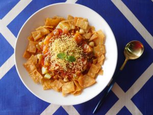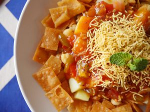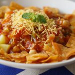 On serving plate,add boiled chickpeas,potato,green chili,prepared manchurian sauce,red chili crushed, chaat masala,papri and sev nimco.