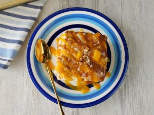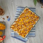 -Drizzle prepared butterscotch sauce,prepared almond crunch,mango chunks,prepared butterscotch whipped cream & spread evenly.