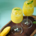 -Blending jug mein mango mixture,cheeni,lemon juice aur yellow food color dal ker ache tarhan blend ker lein phir stainer ki madad sa strain ker lein.