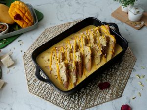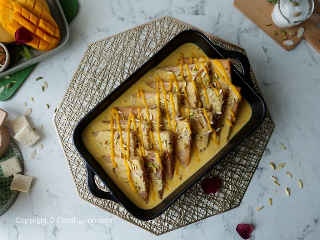 Serving dish mein bread slices rakhd ein,khopra,tayyar mango milk syrup,pista,badam aur tayyar mango & cream sauce dal dein aur thanda serve karein!