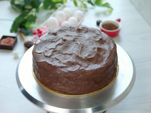 -Place first layer of cake on cake stand & apply prepared chocolate frosting.