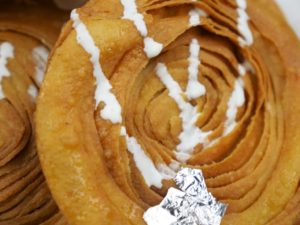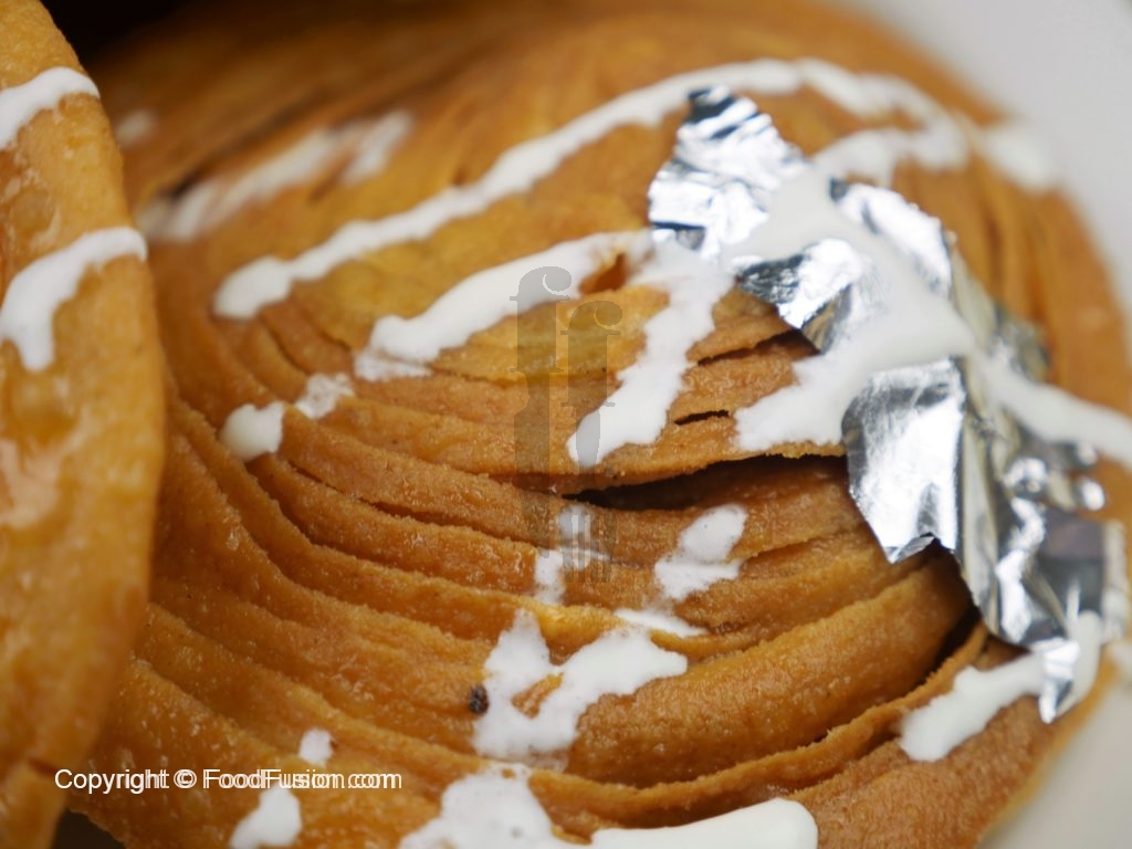 Spread desi ghee evenly over entire surface and dust flour,place another round dough, spread desi ghee and dust flour,repeat this process 2 times more.